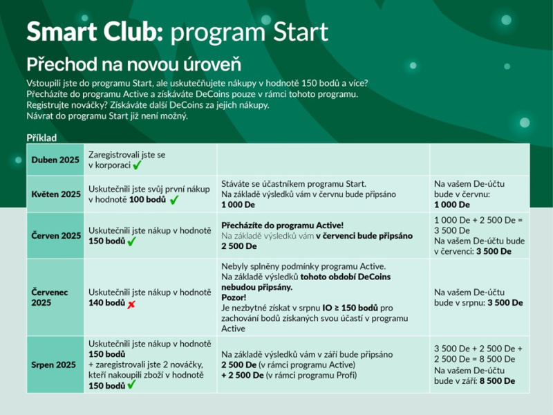 Pokud v programu Start uskutečňujete nákupy v hodnotě 150 bodů a více, automaticky přecházíte do programu Active a získáváte DeCoins pouze v rámci tohoto programu. Návrat do programu Start již není možný!