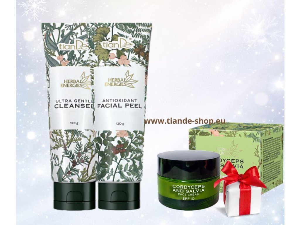 TianDe sada pro čištění pleti, TianDe pleťový gel, antioxidační peeling TianDe, krém s cordycepsem, krém se šalvějí, kompletní péče o pleť TianDe, regenerace a hydratace pleti, přírodní kosmetika TianDe.