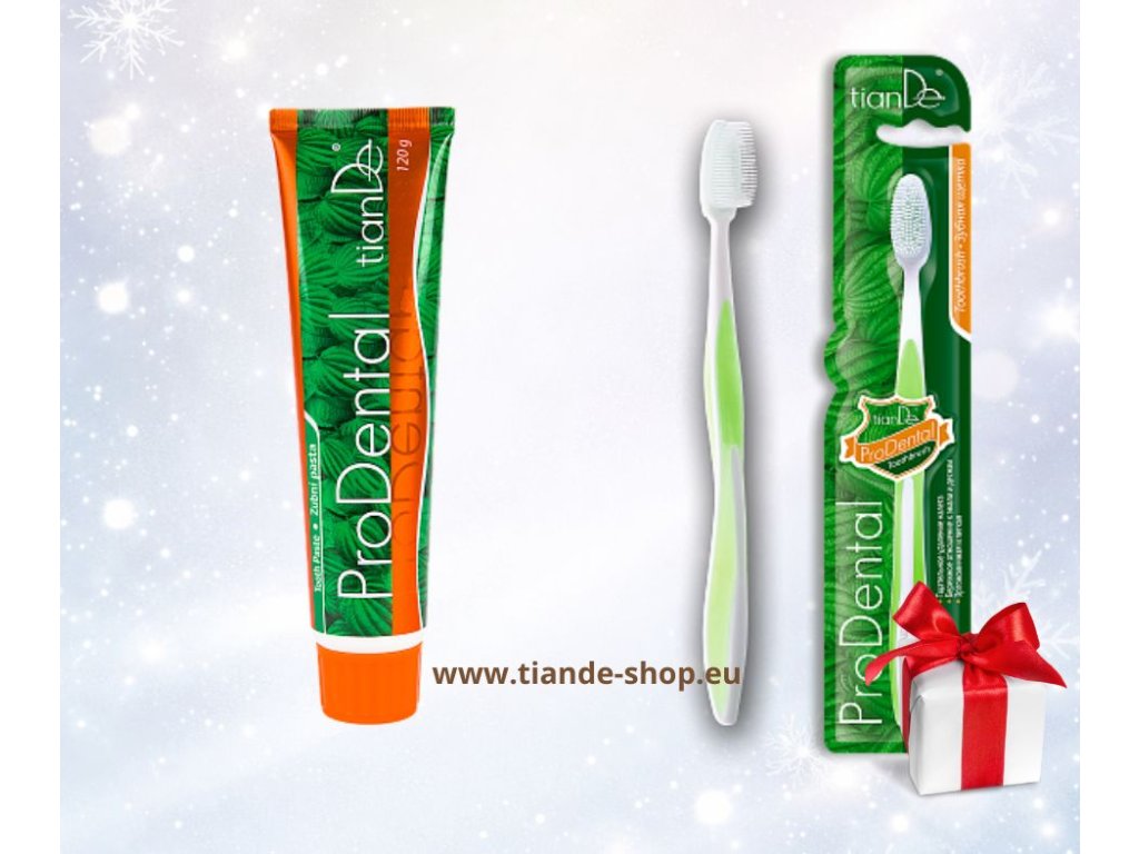Praktická sada TianDe je určena pro každodenní hygienu ústní dutiny a podporu zdravého úsměvu. Kombinace zubní pasty ProDental a kartáčku ProDental zajišťuje účinné čištění zubů, svěží dech a komfort při každodenní péči.